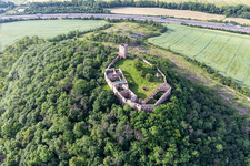 Schrägluftbild von Ruine und Mauerreste der ehemaligen Burganlage und Feste Burg Gleichen an der Thomas-Müntzer-Straße im Ortsteil Wandersleben in Drei Gleichen im Bundesland Thüringen, Deutschland Aufnahme vom 15.06.2019 Bildnr. 007688